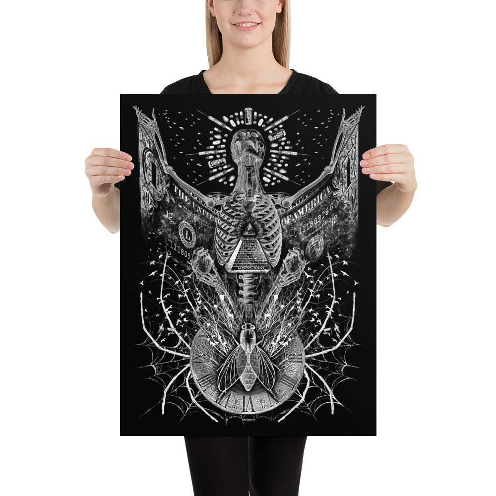 The Capitalist Demon. Represents the chaos and catastrophe going on in our society - the halo of pills symbolizes the healthcare system. The wings represent the economy while the "All Seeing Eye" is for the country being ruled by secret societies. The bee is for us, the worker bees and the trees and birds symbolize that little bit of freedom that we do get - from time to time. This truly captivating work is now available on museum-quality posters made on thick matte paper.
